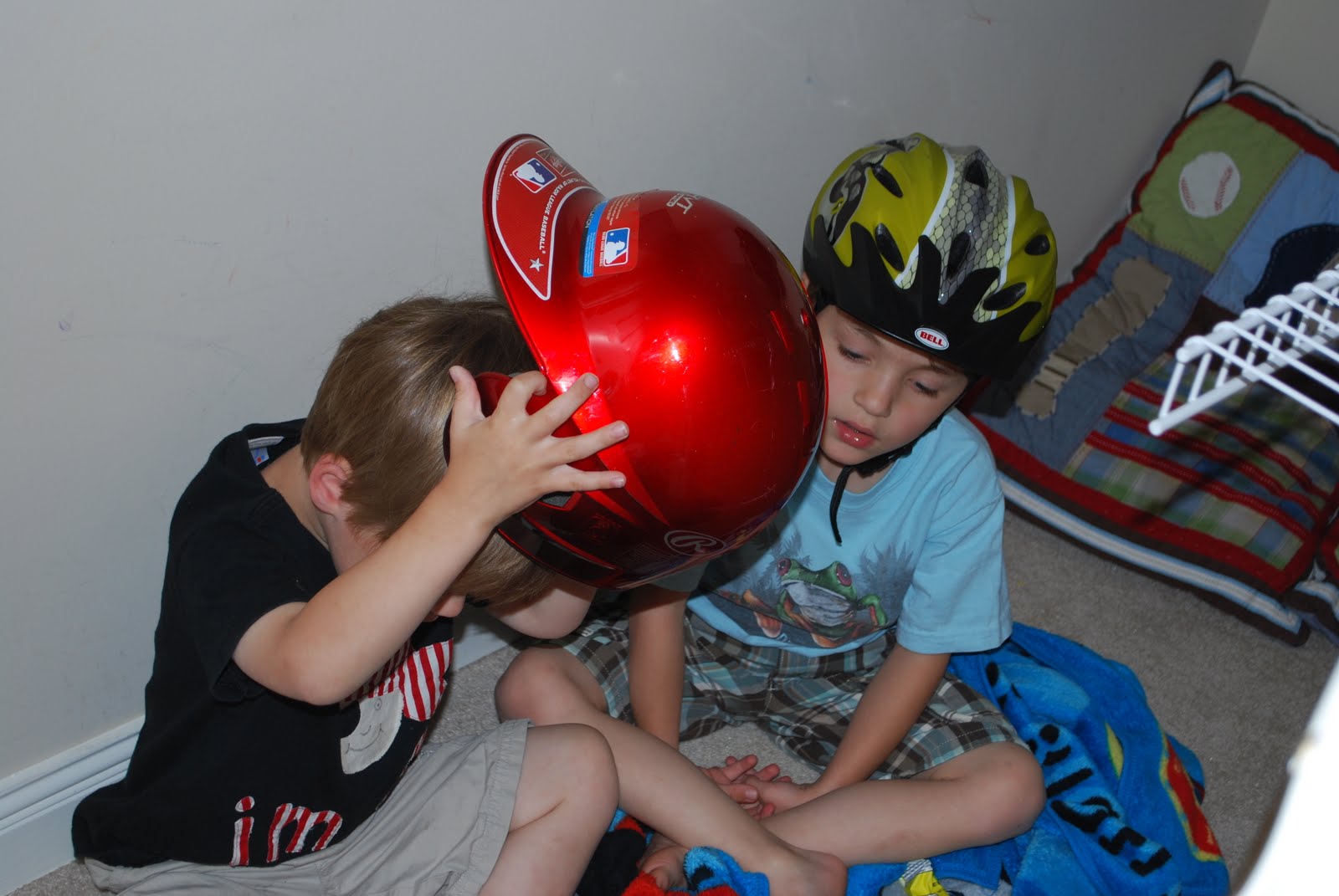 The boys get all excited about it. Of course, N is all business about it. He made sure there were helmets in there to protect their heads. He is not however, responsible for G wearing his helmet backwards.